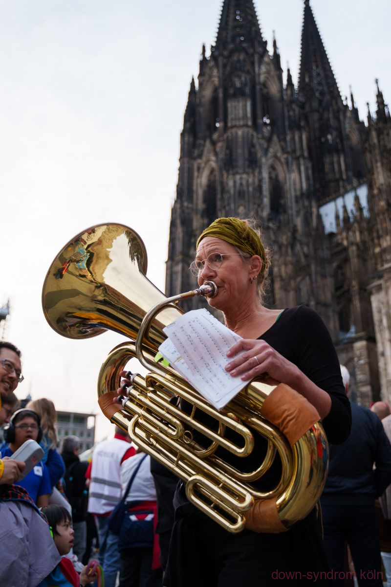 Unser Zug war laut und lustig: Neben den „Helden für Herzen“ in Superhelden-Kostümierung haben uns das Kunstorchester Kwaggawerk (https://kwaggawerk.wordpress.com/) begleitet. Vor dem Kölner Dom fand eine Kundgebung statt. Zu Wort kamen junge Menschen mit Handicap sowie der Vorstand von down-syndrom köln. Zum Abschluss spielte die Kölsche Band Auerbach für uns. Das Highlight: die Jecke Öhrcher begleiteten den Song „21“ mit Gebärden.