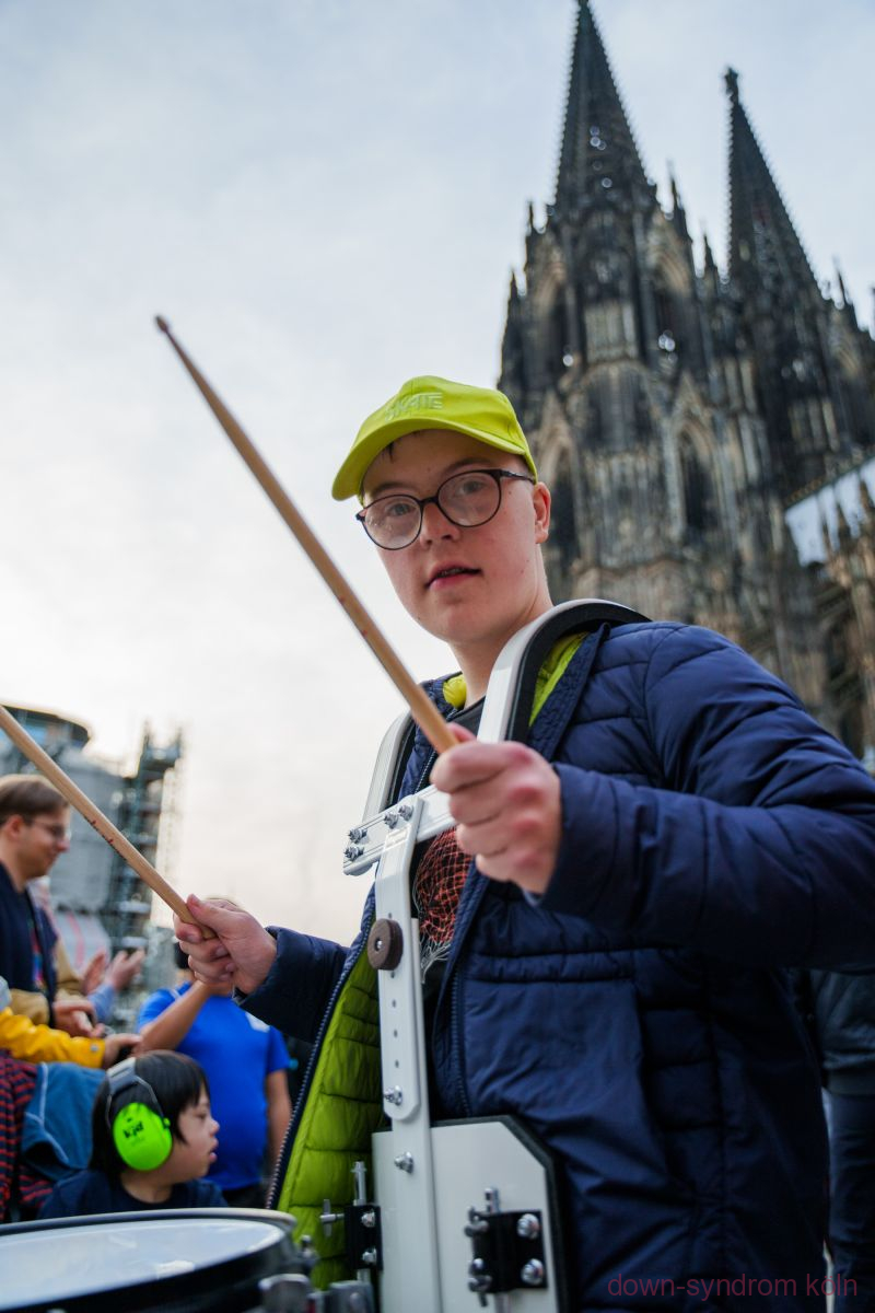 Unser Zug war laut und lustig: Neben den „Helden für Herzen“ in Superhelden-Kostümierung haben uns das Kunstorchester Kwaggawerk (https://kwaggawerk.wordpress.com/) begleitet. Vor dem Kölner Dom fand eine Kundgebung statt. Zu Wort kamen junge Menschen mit Handicap sowie der Vorstand von down-syndrom köln. Zum Abschluss spielte die Kölsche Band Auerbach für uns. Das Highlight: die Jecke Öhrcher begleiteten den Song „21“ mit Gebärden.