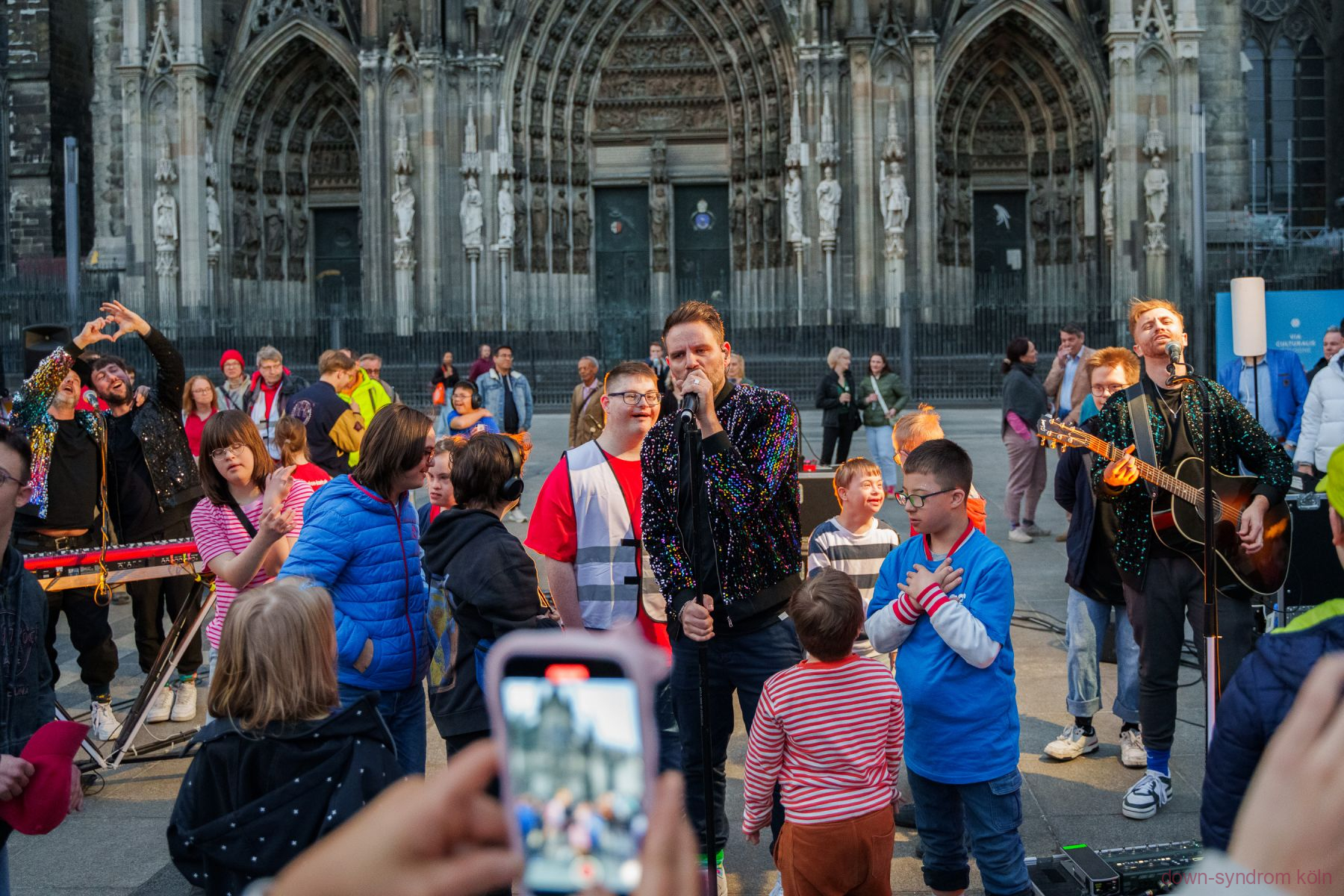 Unser Zug war laut und lustig: Neben den „Helden für Herzen“ in Superhelden-Kostümierung haben uns das Kunstorchester Kwaggawerk (https://kwaggawerk.wordpress.com/) begleitet. Vor dem Kölner Dom fand eine Kundgebung statt. Zu Wort kamen junge Menschen mit Handicap sowie der Vorstand von down-syndrom köln. Zum Abschluss spielte die Kölsche Band Auerbach für uns. Das Highlight: die Jecke Öhrcher begleiteten den Song „21“ mit Gebärden.