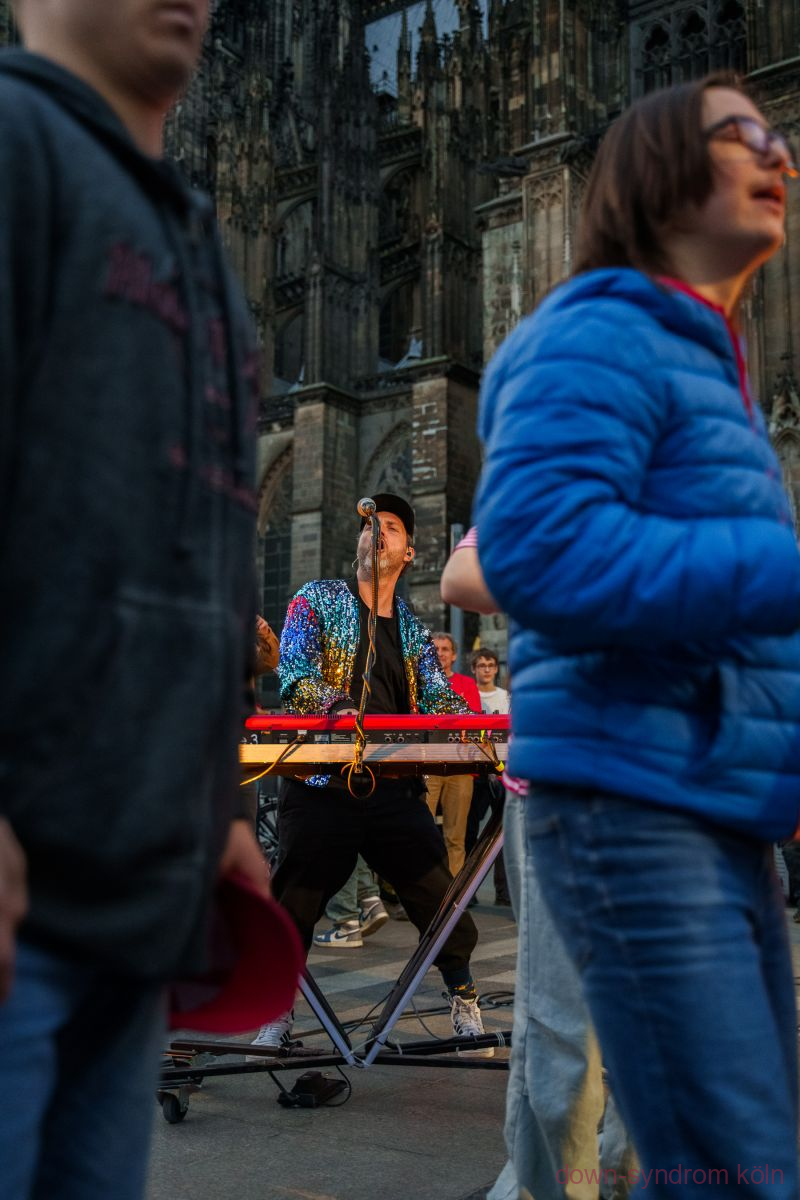 Unser Zug war laut und lustig: Neben den „Helden für Herzen“ in Superhelden-Kostümierung haben uns das Kunstorchester Kwaggawerk (https://kwaggawerk.wordpress.com/) begleitet. Vor dem Kölner Dom fand eine Kundgebung statt. Zu Wort kamen junge Menschen mit Handicap sowie der Vorstand von down-syndrom köln. Zum Abschluss spielte die Kölsche Band Auerbach für uns. Das Highlight: die Jecke Öhrcher begleiteten den Song „21“ mit Gebärden.